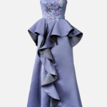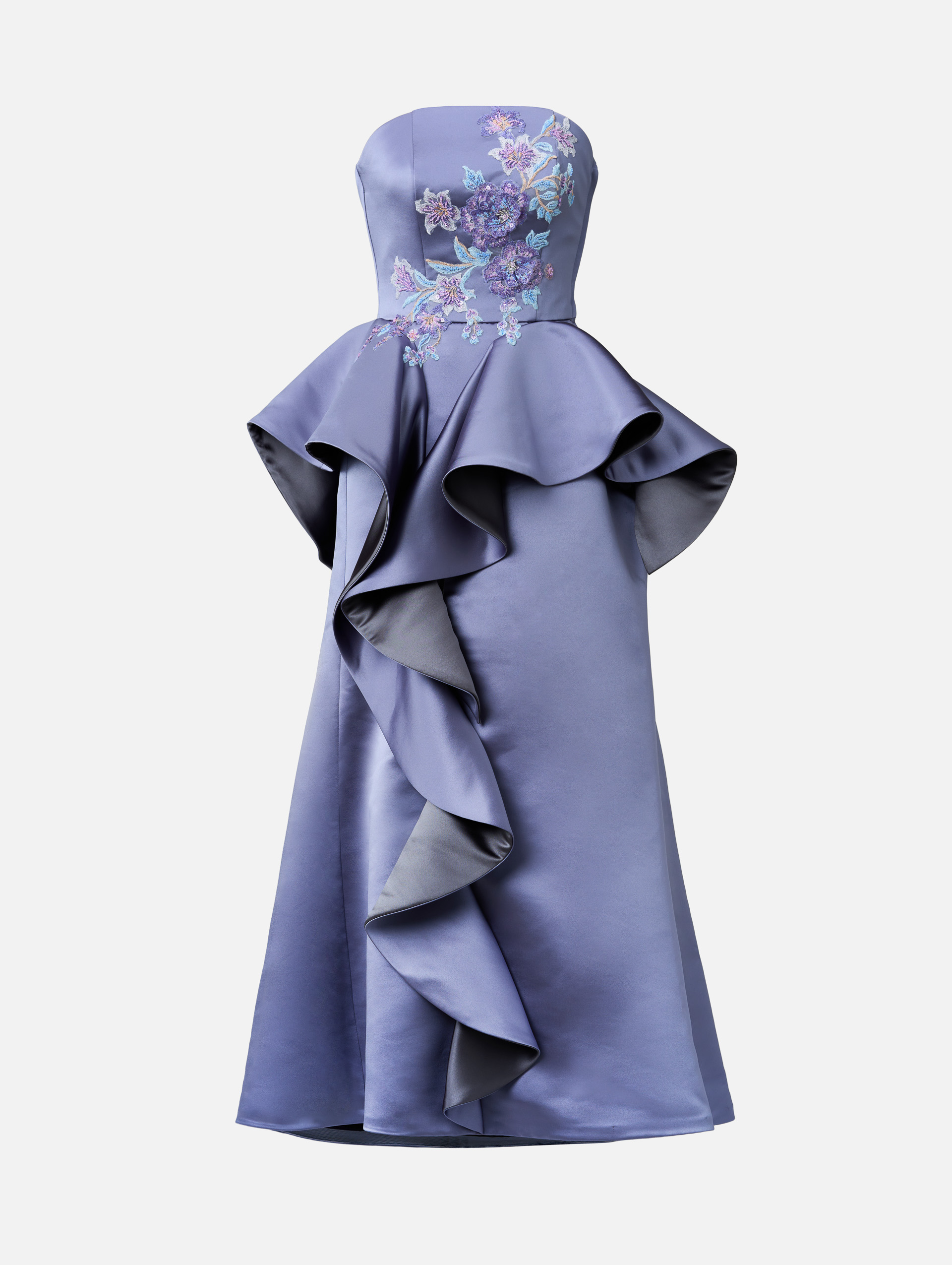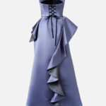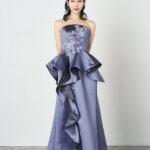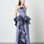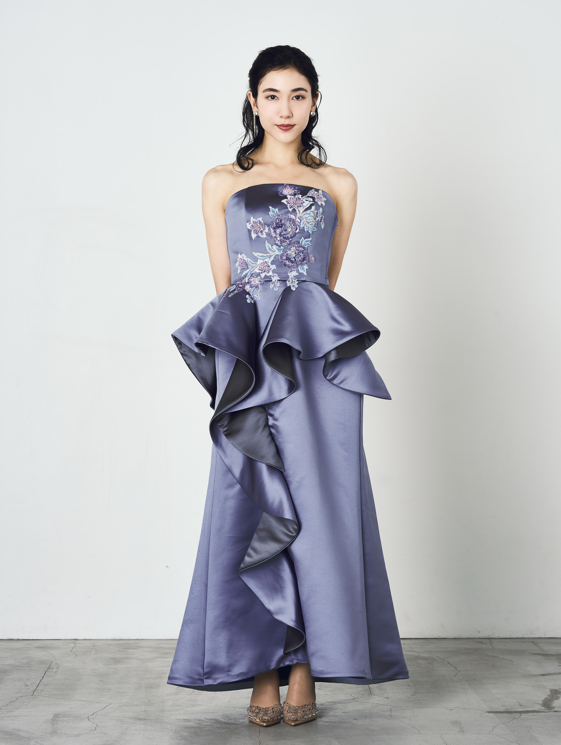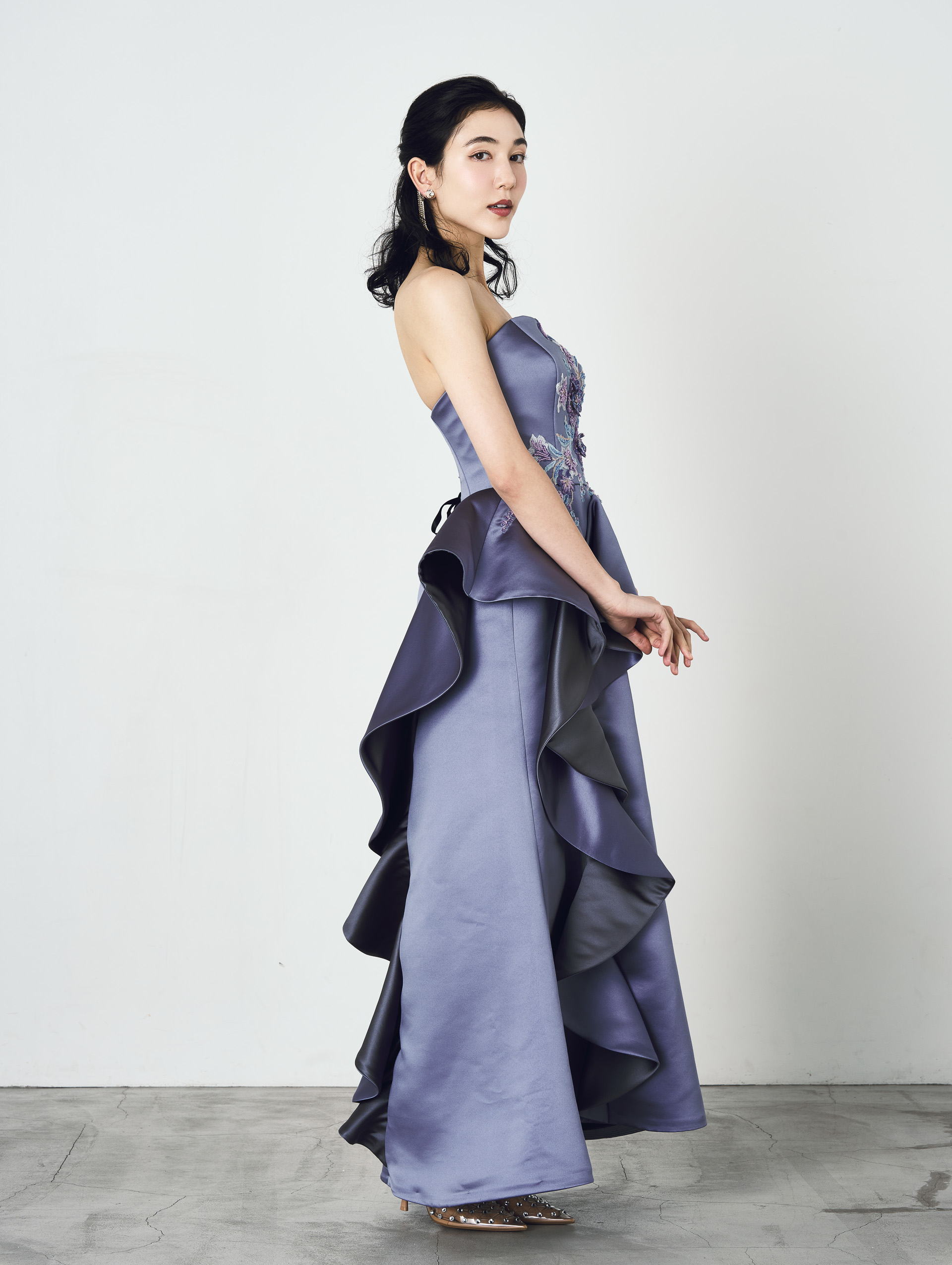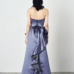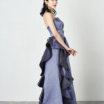 厚手ダッチェスサテンを使用したアシメトリードレープスカートドレス。