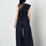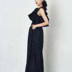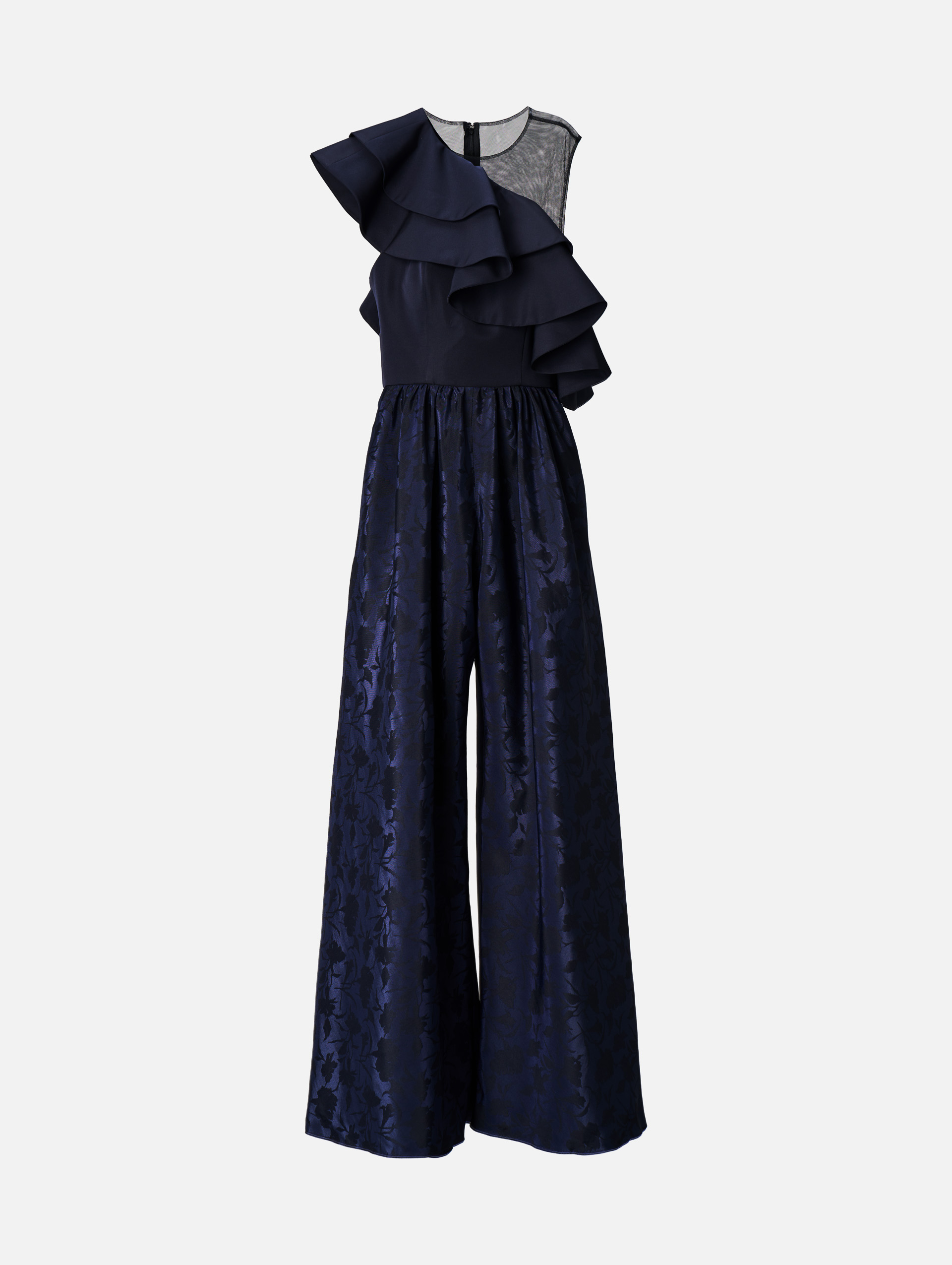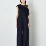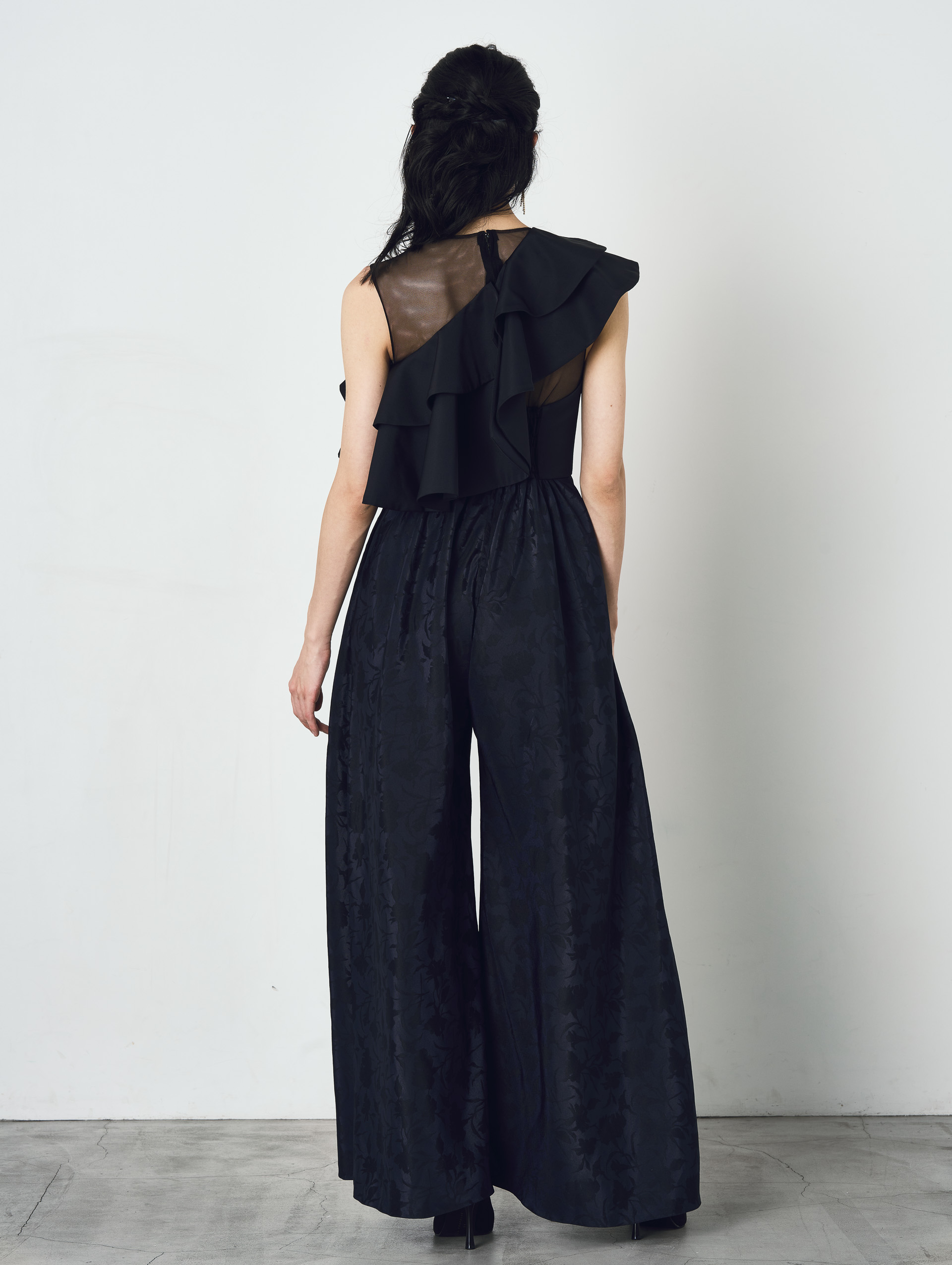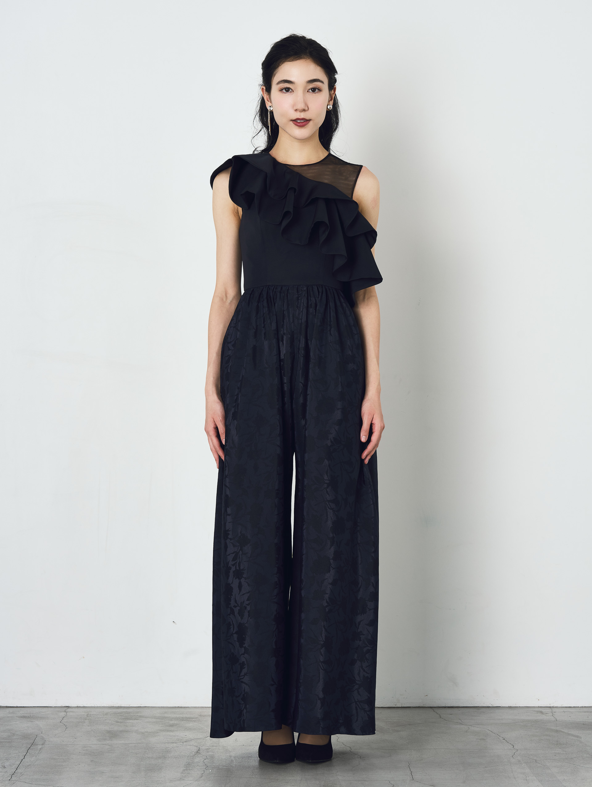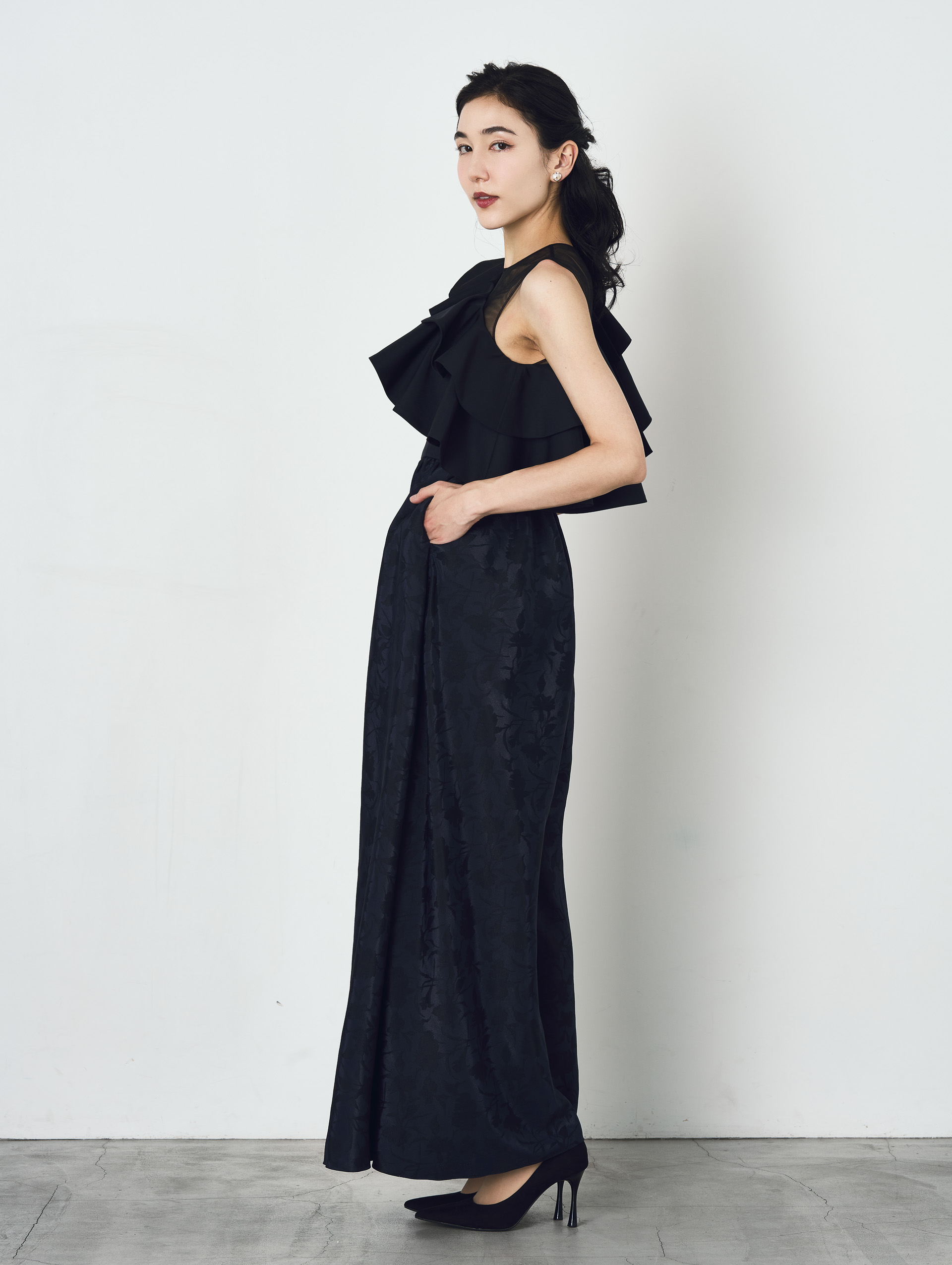 ショルダーフリルとジャガード素材の木見合わせがモードなパンツドレス。