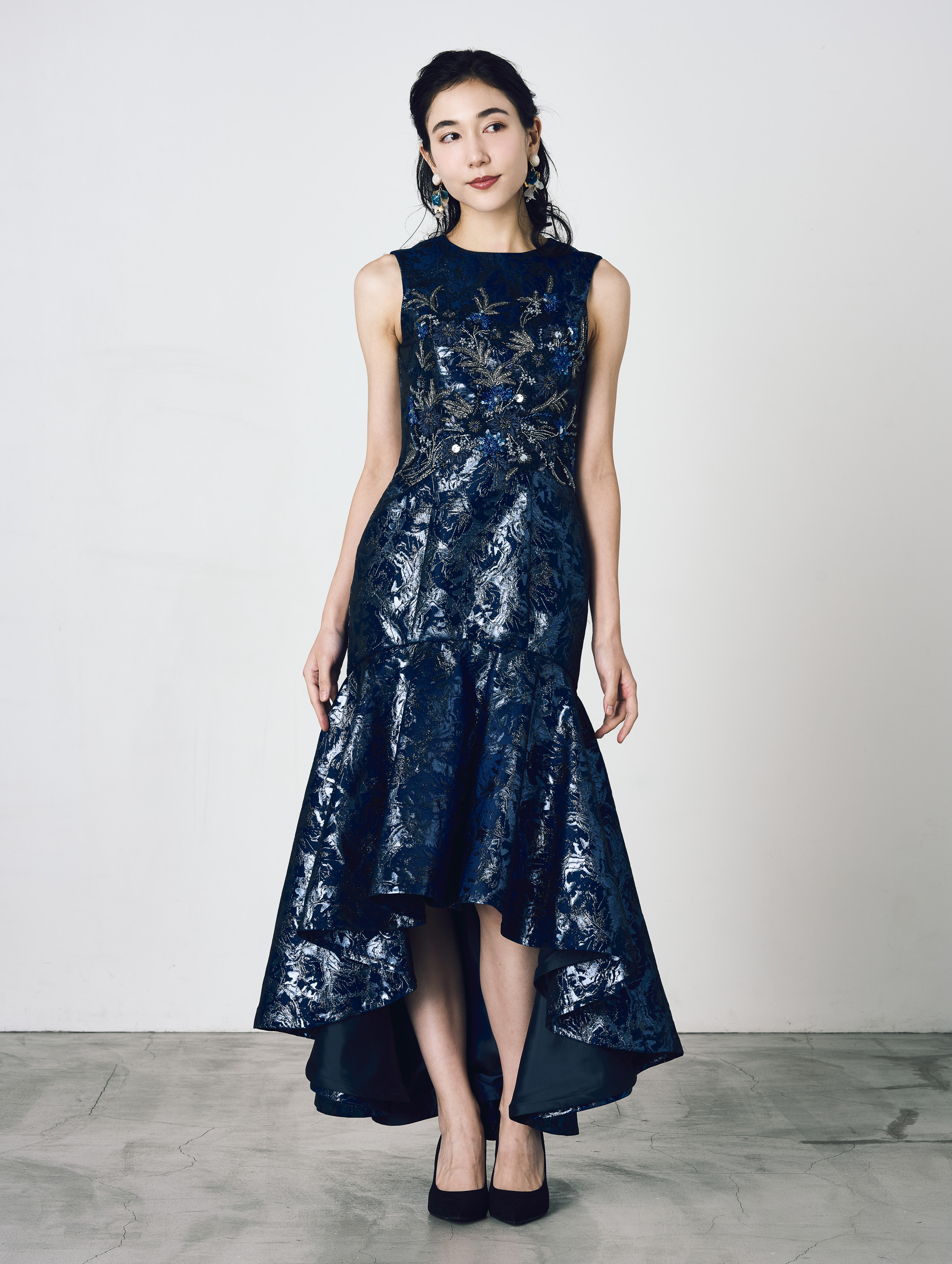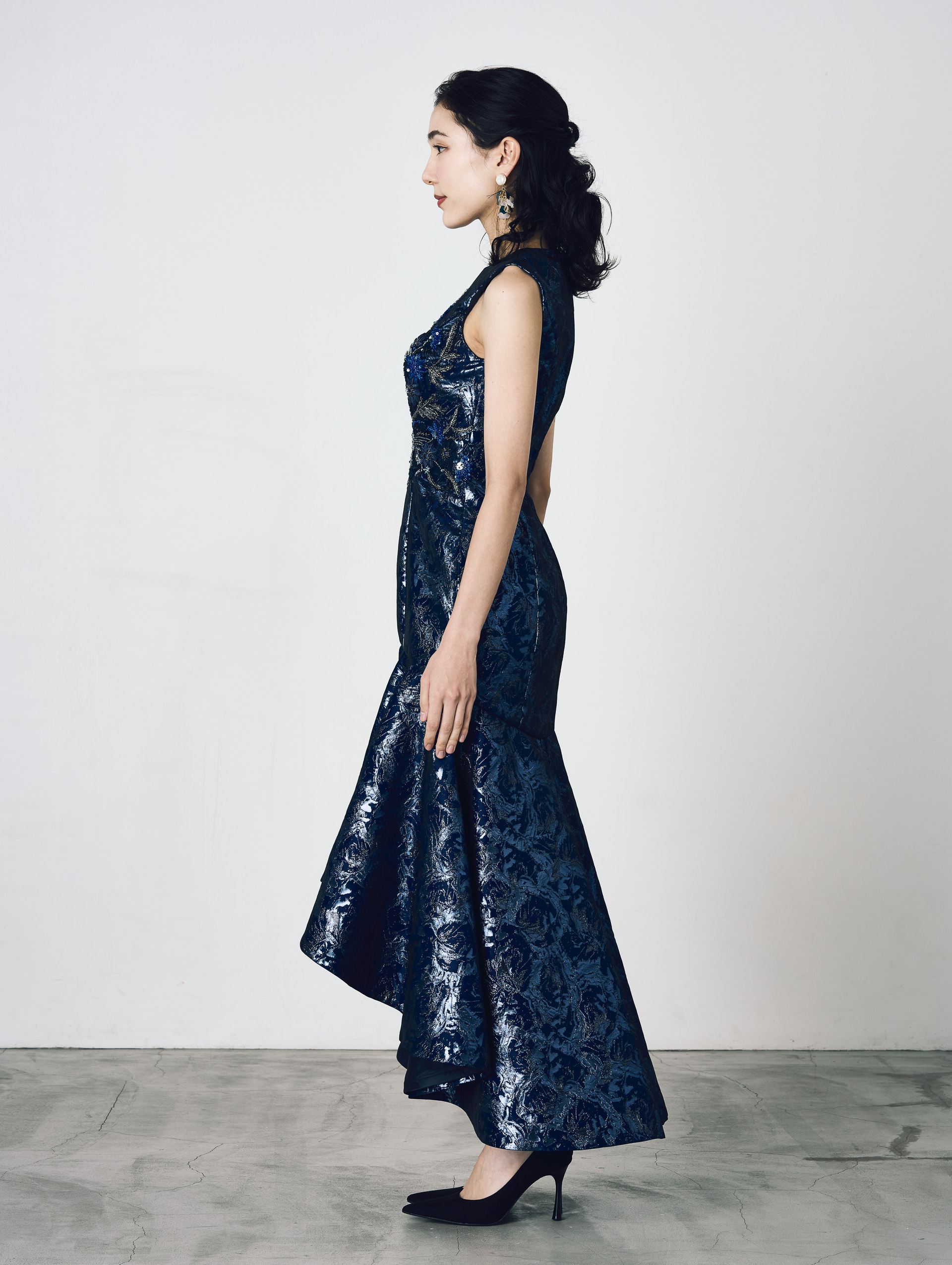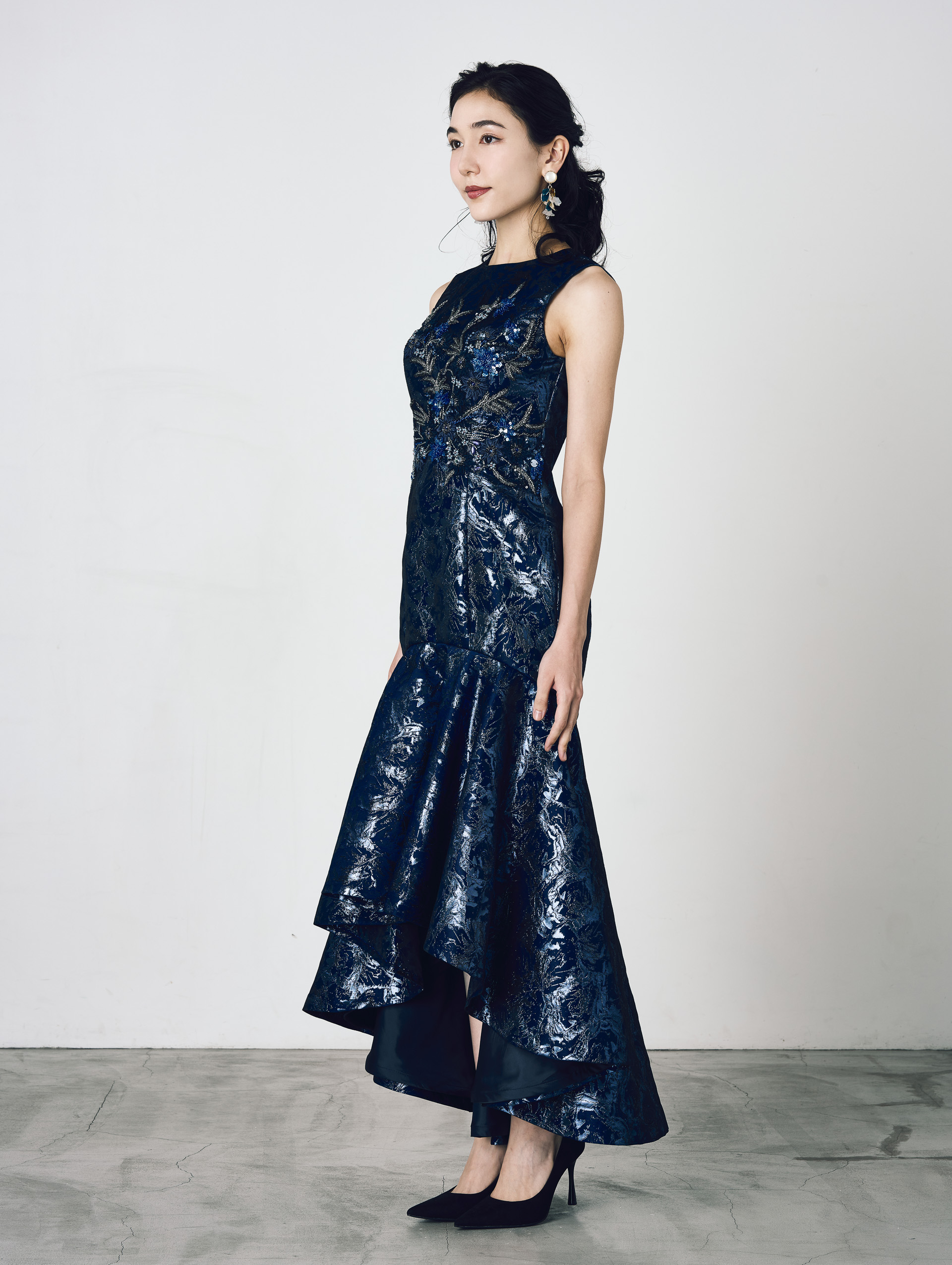 最高級のイタリアンジャガードとビジューレースを使用した贅沢なドレス。丈の長さはフルレングスを指示可能