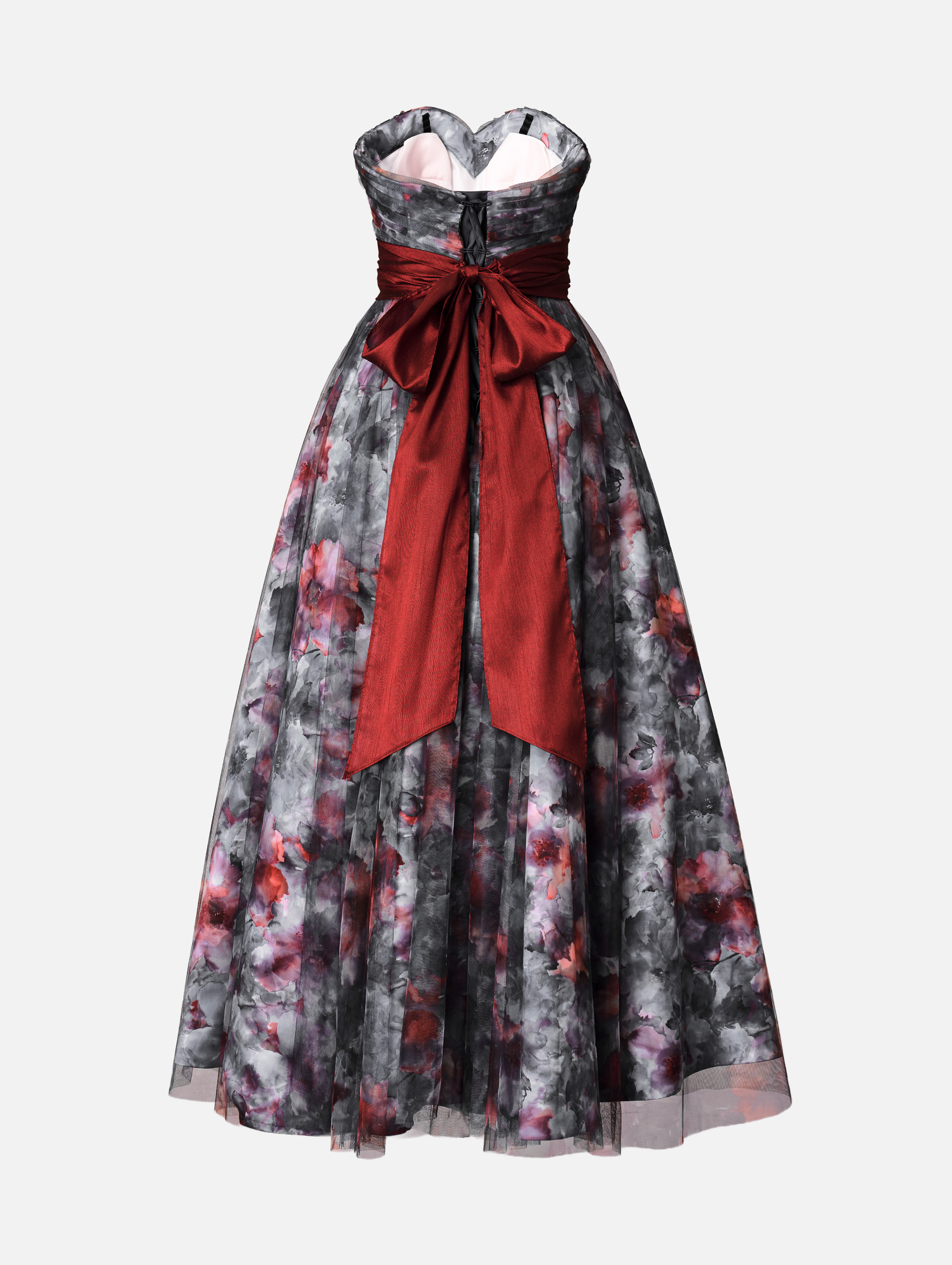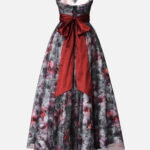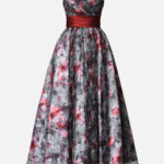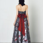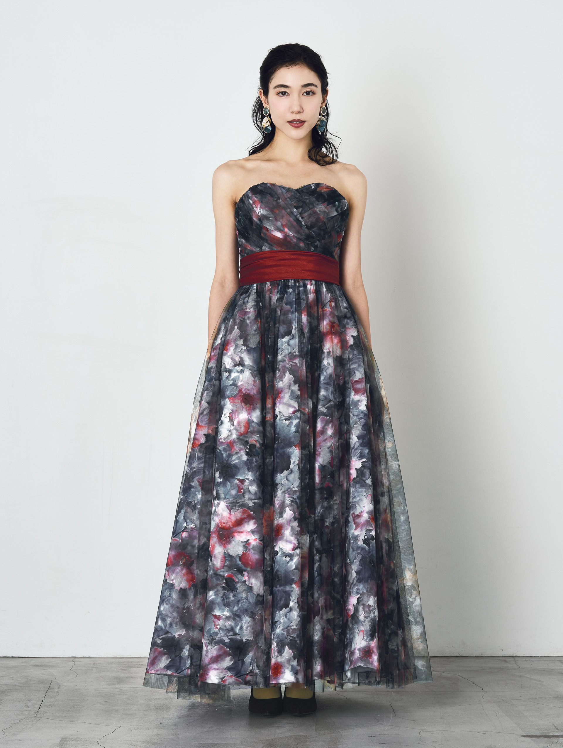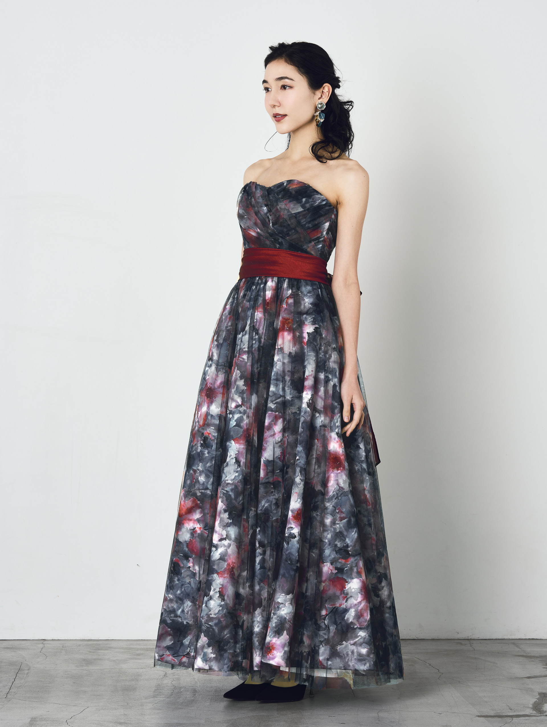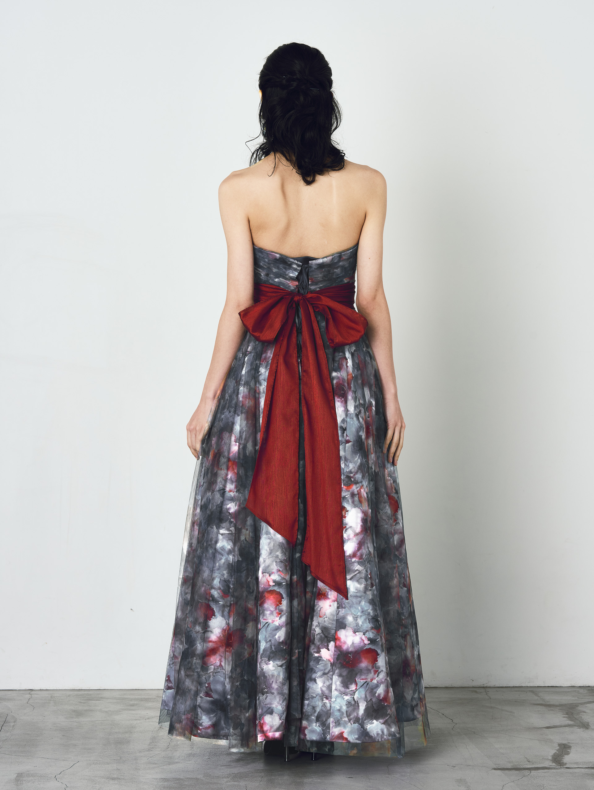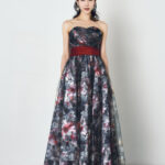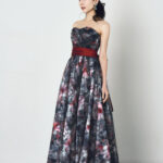 ご希望のプリント柄を指定して制作可能なドレス。ベースのサテンと上側のチュールに二重にプリント加工した特別仕様。