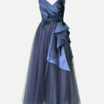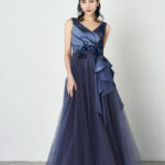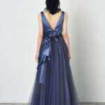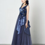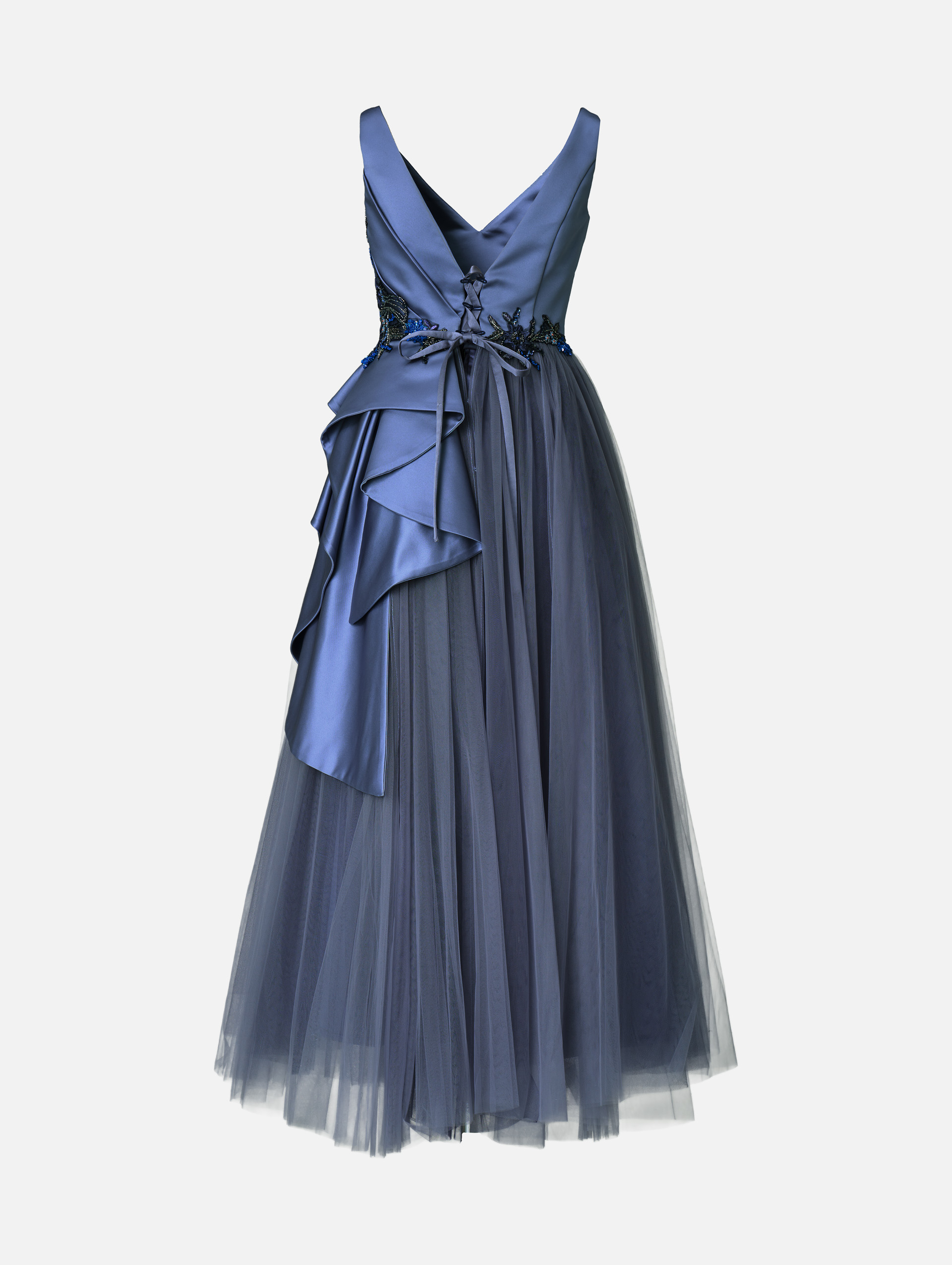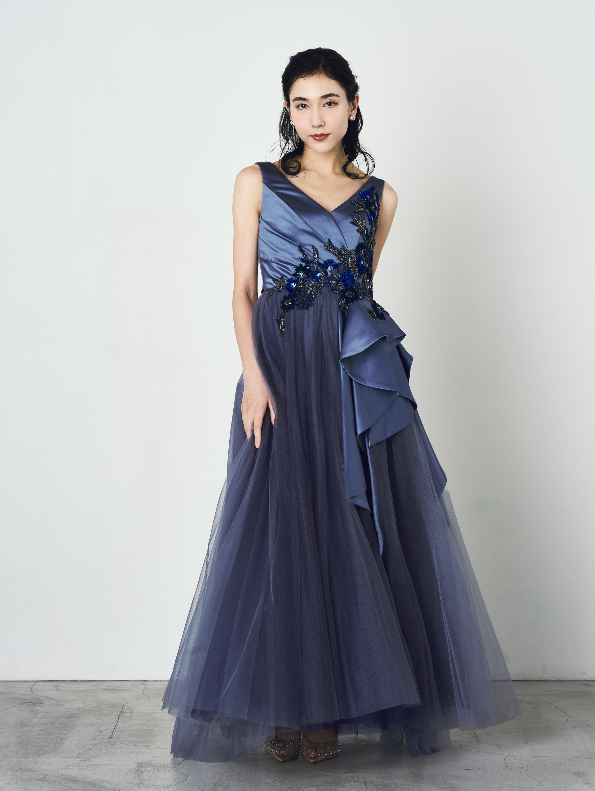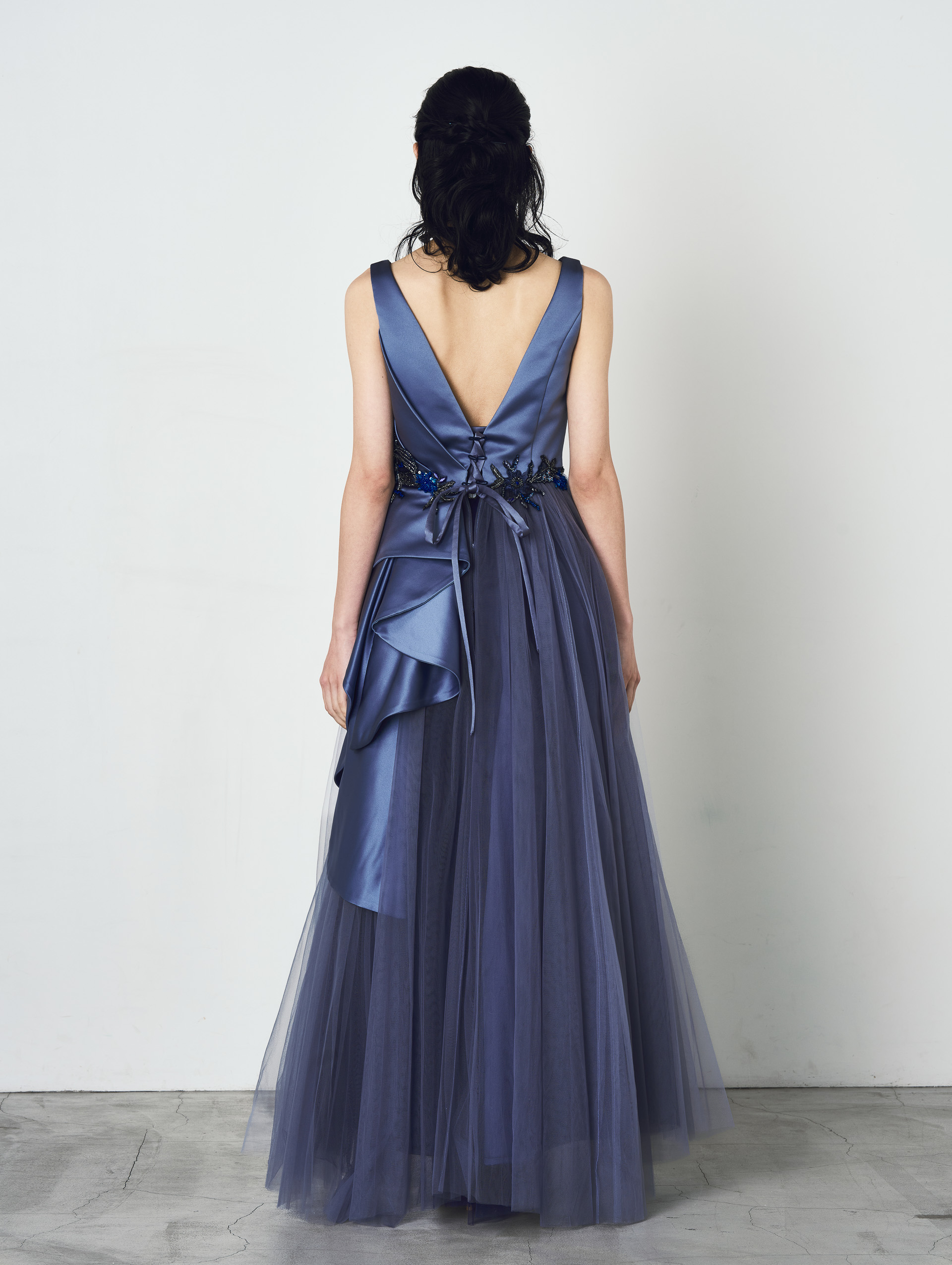 ダッチェスサテンとチュールを使用したアシメトリードレープスカートドレス。立体的なインポートビジュー使用。